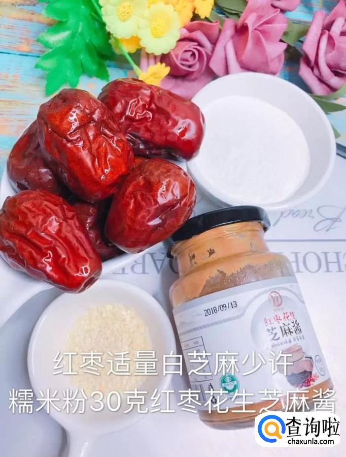 首先准备好要用到的所有食材,如下图所示。小贴士:红枣适量,白之麻少许,糯米粉30克,红枣花生芝麻酱适量。