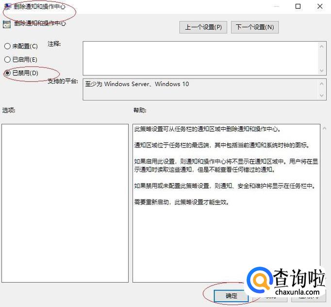 弹出"删除通知和操作中心"对话框,如图所示。勾选"已禁用"单选框,设置完成点击"确定"按钮。