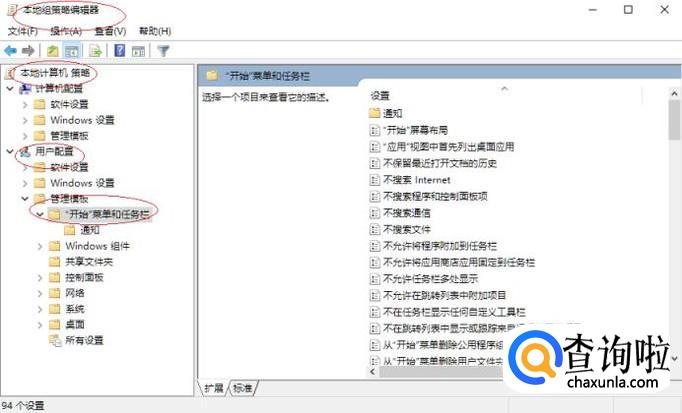 如图所示,展开"管理模板"文件夹。选择"开始菜单和任务栏"项,显示所有"开始菜单和任务栏"策略。