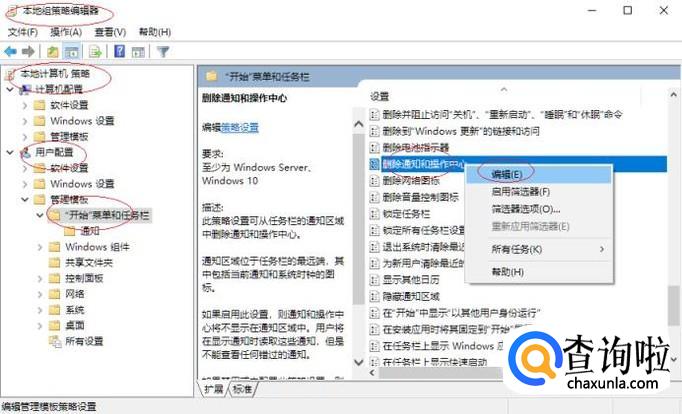 如图所示,鼠标右击"删除通知和操作中心"策略。弹出快捷关联菜单,点击"编辑"项。