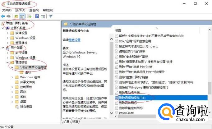 拖动右侧垂直滚动条,如图所示。选择"删除通知和操作中心"策略,下步将进行排除操作中心开关灰色无法选择的故障。