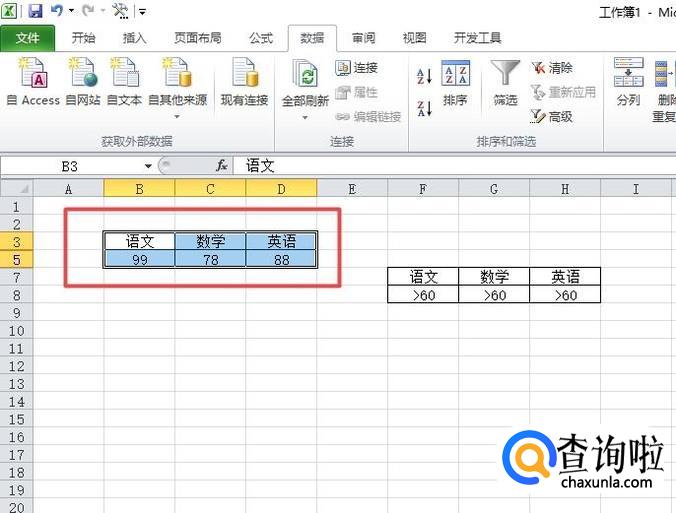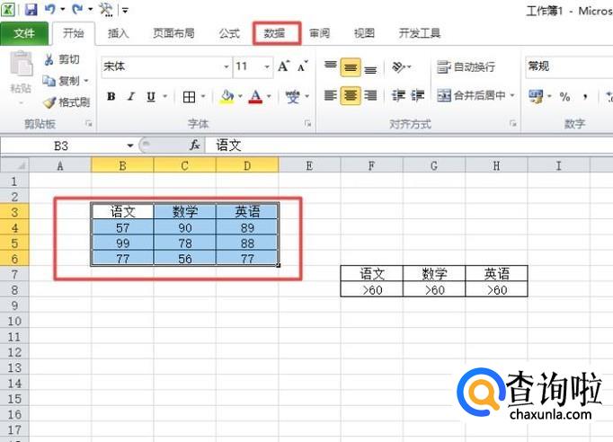 之后我们点击选中图示中的区域,然后点击工具栏中的数据;