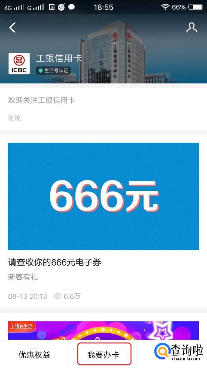 关注之后,就会进入工银信用卡生活号(在支付宝“朋友”里面,可以看到该生活号),我们看到底部有“我要办卡”选项,我们点击一下。