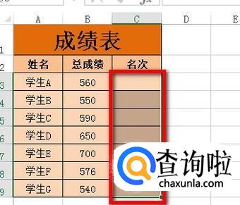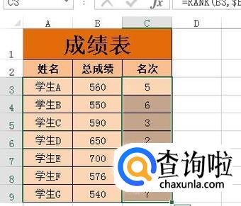 按下CTRL+ENTER,C3:C9这区域单元格即自动显示出数字。这些数字就是名次。