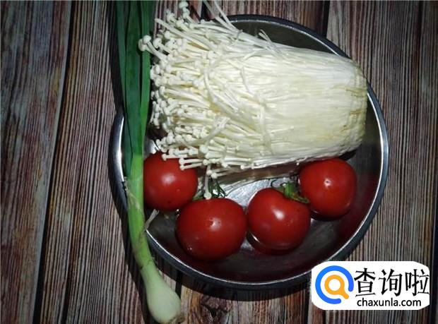 准备好所有材料:番茄4颗、金针菇一扎、香葱一根,蒜头一瓣。