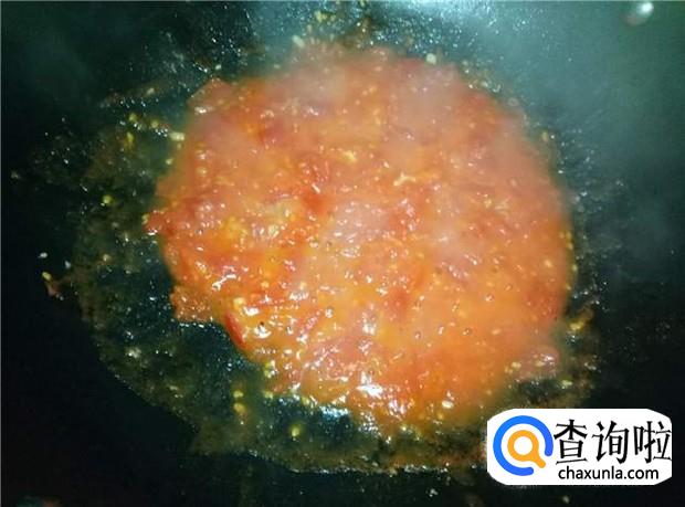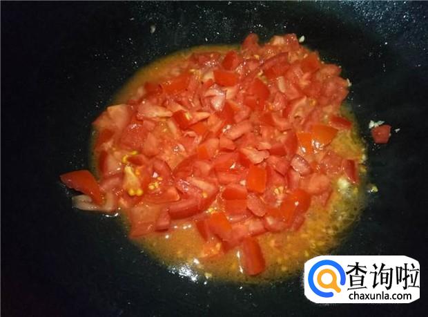 然后倒入番茄,调小火,加入适量的盐,用锅铲按压翻炒番茄,让番茄丁变成番茄酱。