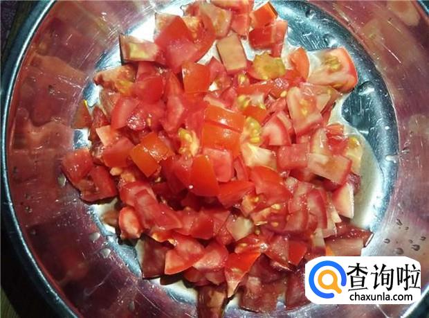番茄用热水烫一下,剥掉皮,然后切成丁状,备用。