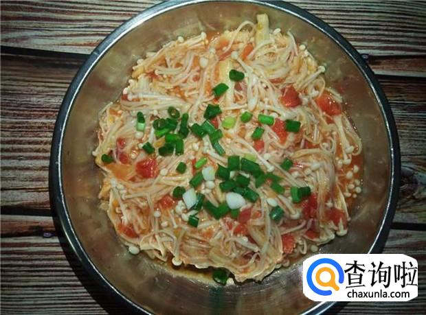 金针菇装盆,撒上葱花,即可享受美味酸甜的金针菇了。