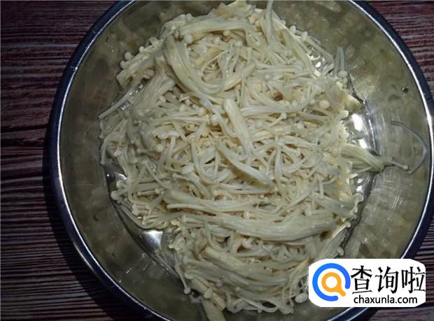 锅里烧开一锅水,放入金针菇,烫三分钟,捞起来沥干水分备用。