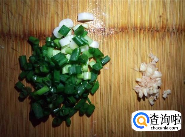 香葱切碎,蒜头剁碎,备用。