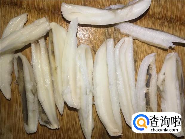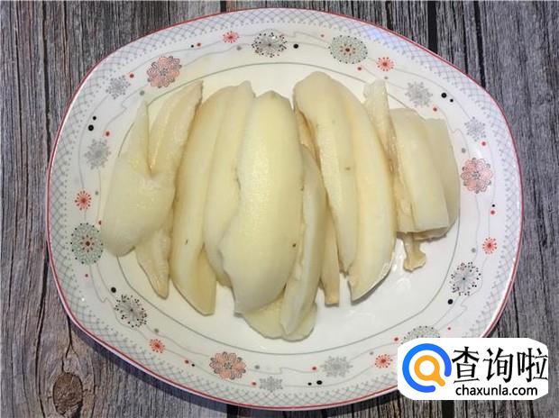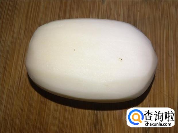 莲藕削皮,沿着莲藕中间的孔切开,孔里面有很多泥土的。
