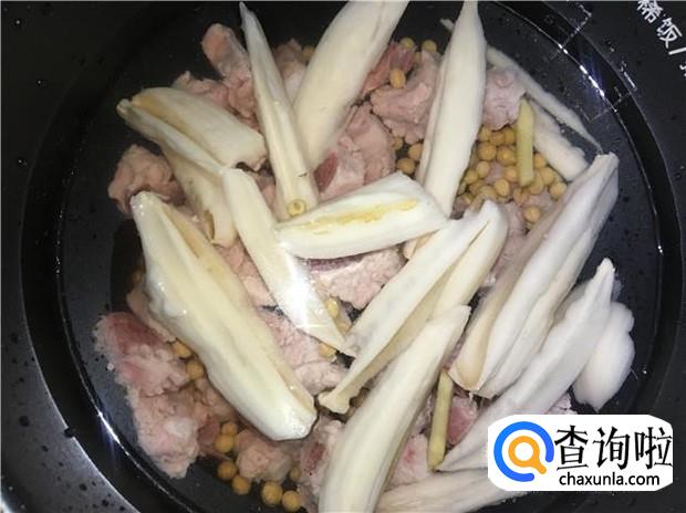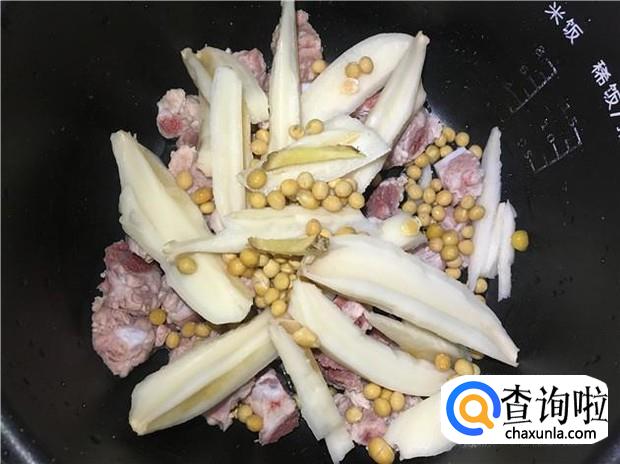 再把排骨、莲藕、黄豆、姜丝,一起放入电饭锅中,加入适量的清水,电饭锅按煮汤功能,大概炖40分钟即可,排骨比较好熟的。