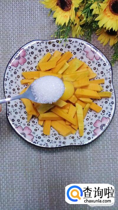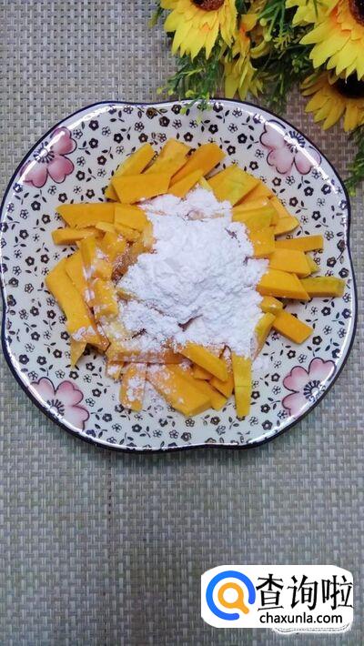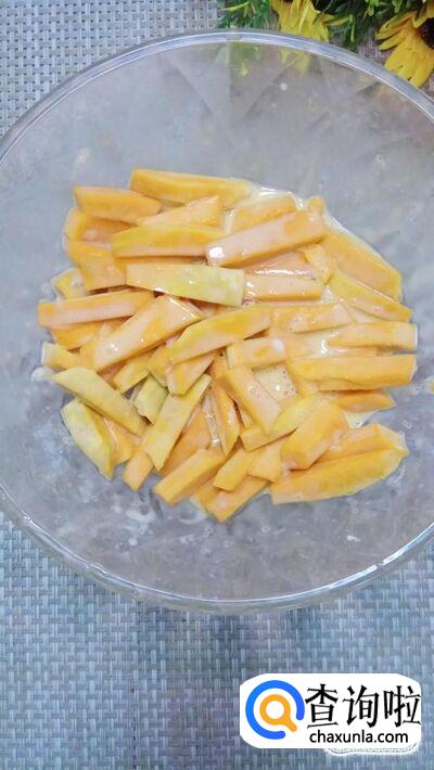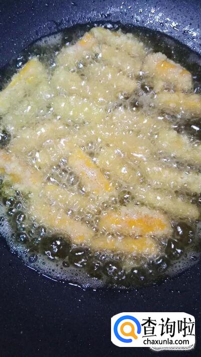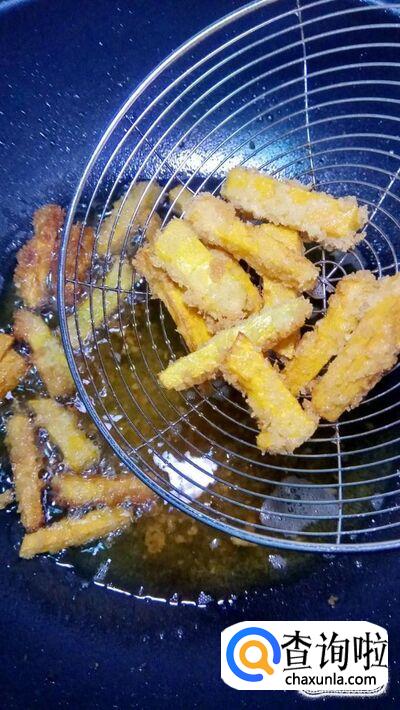 锅中放入适量油,油热后,将南瓜条放入锅中,小火慢炸,注意,火不能太大。