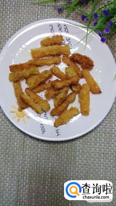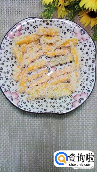 让人南瓜条均匀的沾上一层面包糠,放入盘中备用。