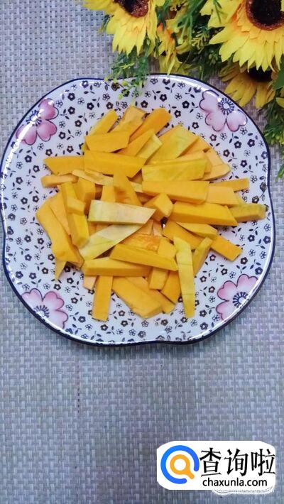 准备适量南瓜,洗净,去皮后,切成小段,大约和人的小拇指一样粗细就可以了。