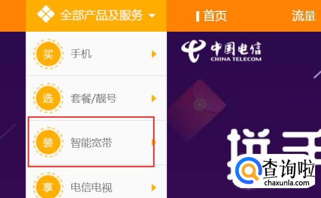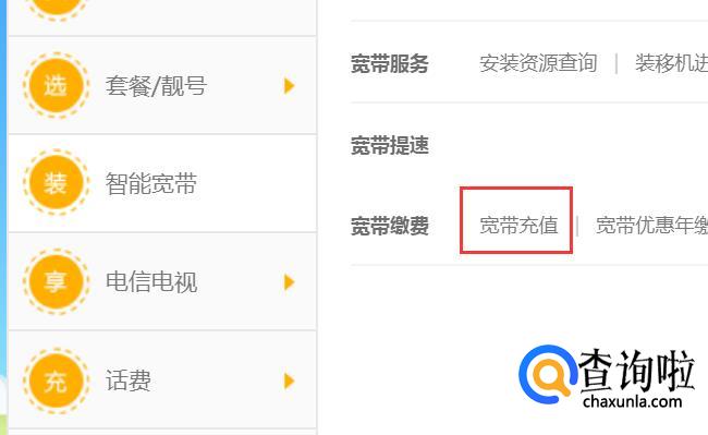 在主页面左边的菜单栏将鼠标移到“智能宽带”,选择“宽带充值”。
