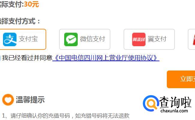 在下方选择你想要的支付方式,现在支持除了常用的银联和网银支付,还支持微信、支付宝和翼支付,选择完成,点击立即支付。