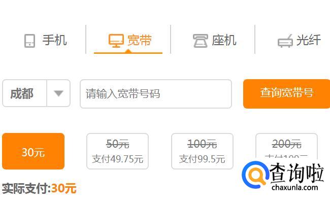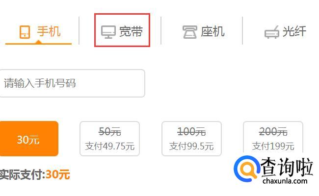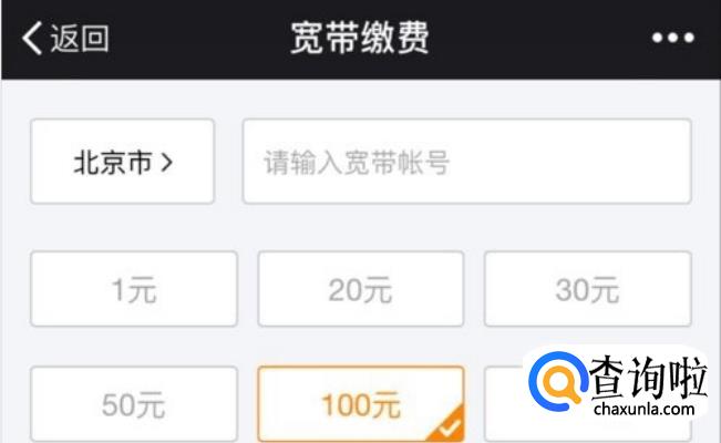 等待页面跳转后,点击“宽带”,并在下方输入自己家里的宽带账号,点击查询宽带确认是否有误,然后选择要充值的金额。
