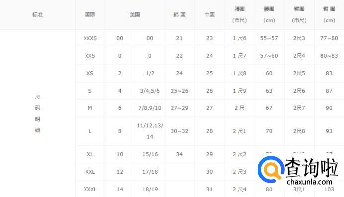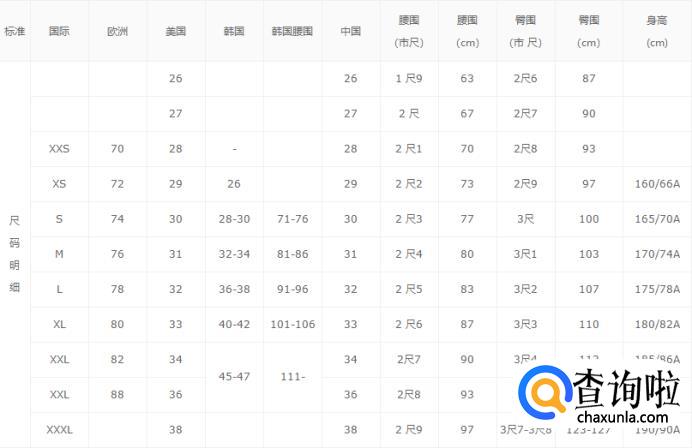 女装裤子尺码表:
