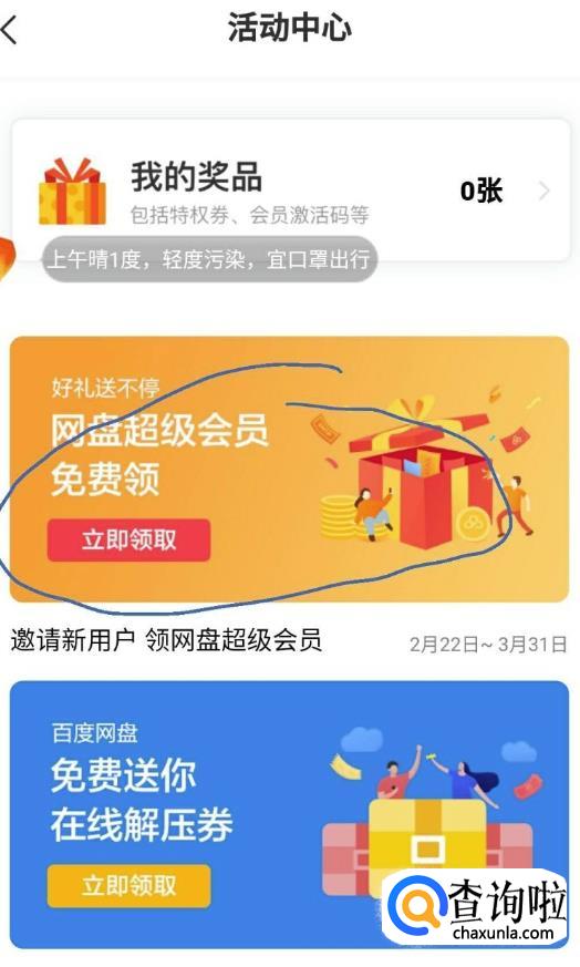 在活动中心里面选择“网盘超级会员免费领”。