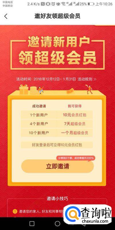 这个活动只要你邀请好友就可以获得超级会员。