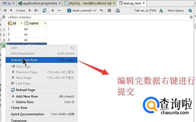 编辑完新的数据以后需要右键单击数据行,然后选择Submit New Row选项,如下图所示