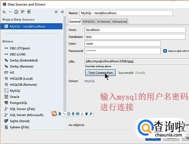 接下来在弹出的Data Sources and Drivers界面中输入Mysql的用户名和密码进行数据库连接,如下图所示