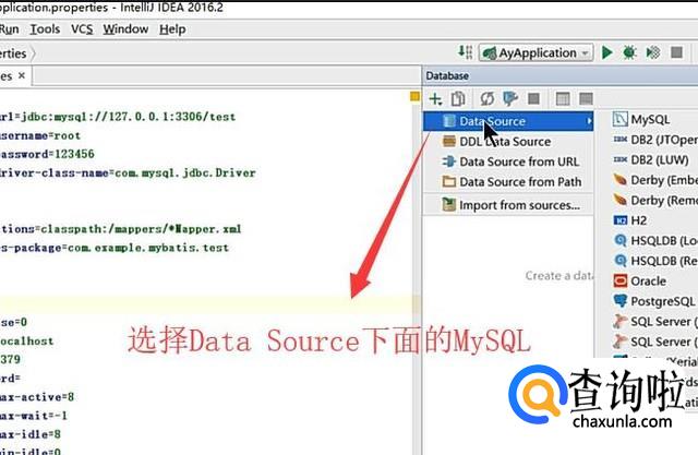 首先点击右侧的Data Source,选择下拉菜单中的MySQL选项,如下图所示