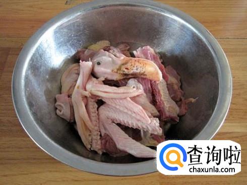 把鸭子去毛和内脏后,清洗干净,用刀剁成小段鸭块,葱姜蒜切成段,香菇洗净。