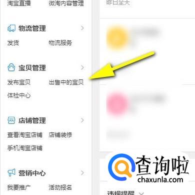 在页面的左侧这里找到并点击:出售中的宝贝