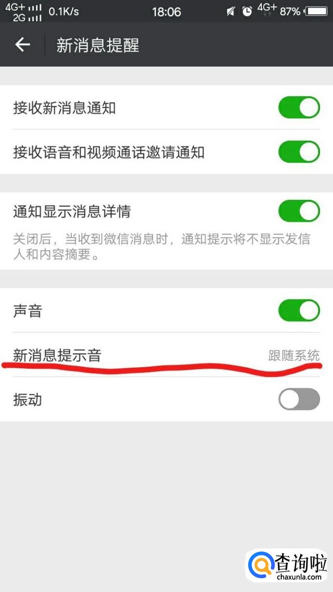 最后,先将接受新消息提醒打开,再打开声音,然后点击"跟随系统",然后找到自己喜欢的声音,点击它保存即可。