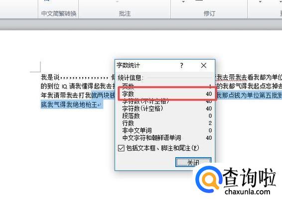结果如图所示,我们看到我们选中的文字的字数一共是40个。