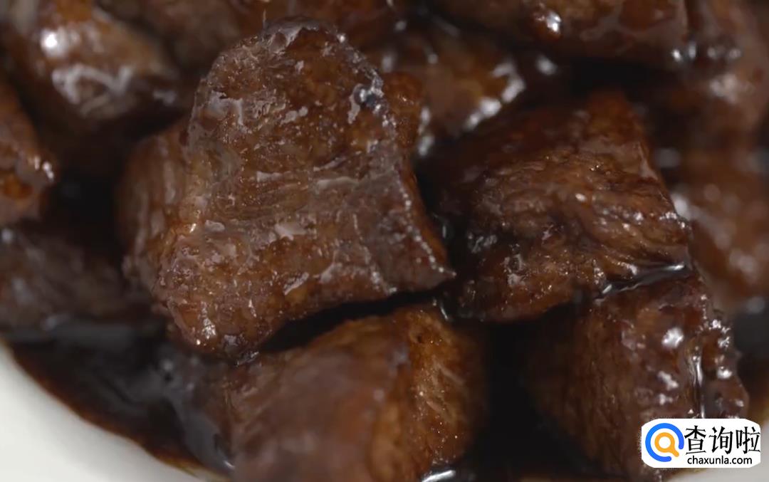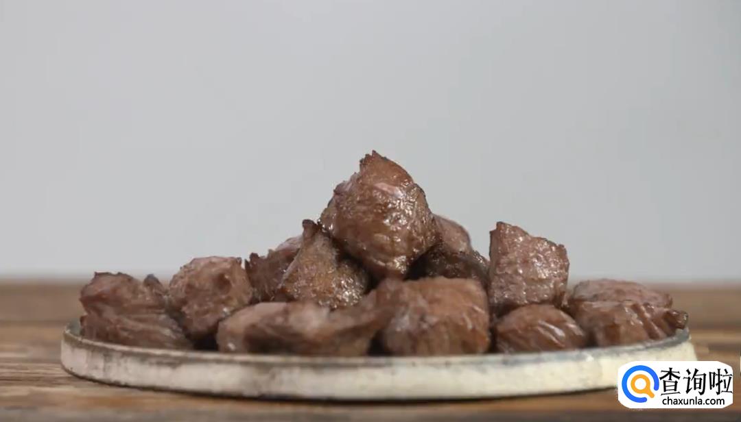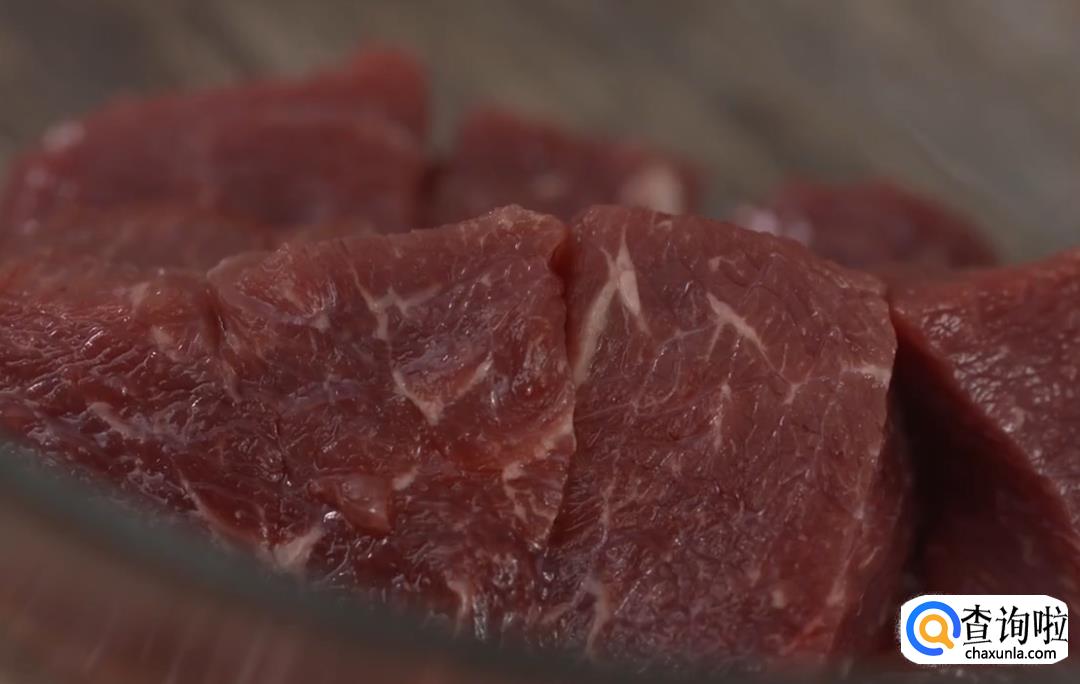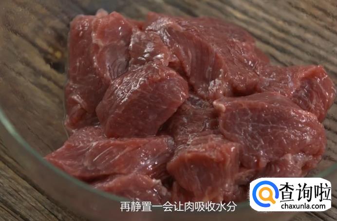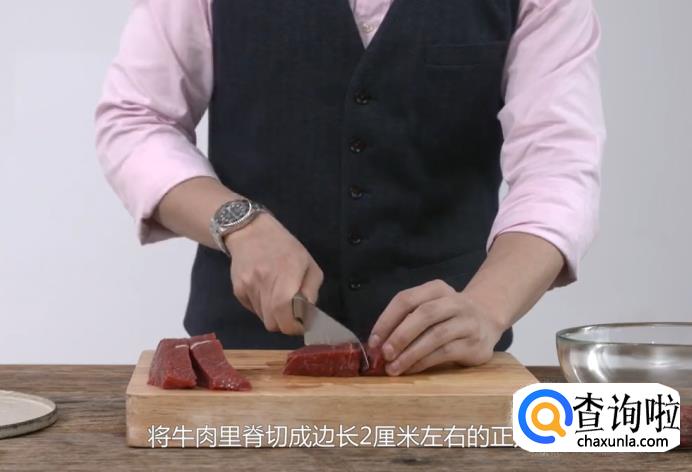 选用带有油脂的牛里脊肉,将牛里脊切成边长2厘米左右的正方块。