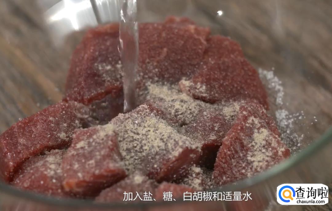 加入盐、糖、白胡椒和适量水,用手抓匀,直到肉松软了为止;再静置一会让肉吸收水分。