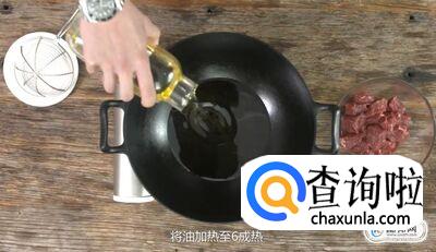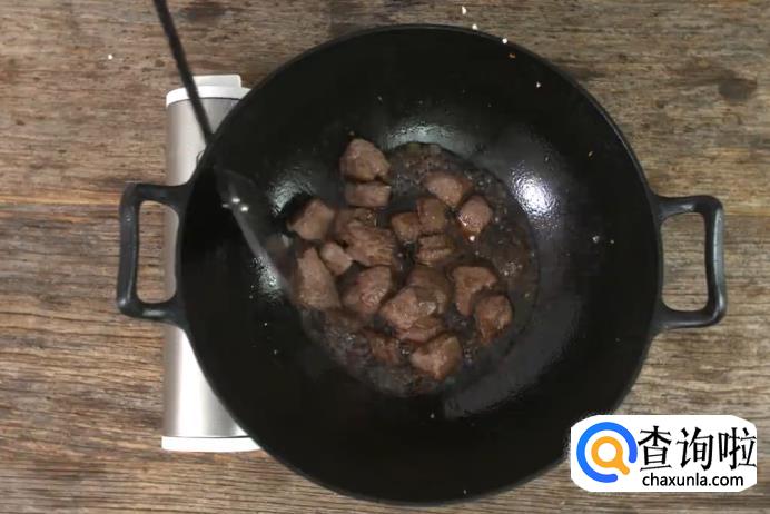 起油锅,将油加热至6成热时放入牛肉粒,将牛肉粒炸至外层起壳后捞出。