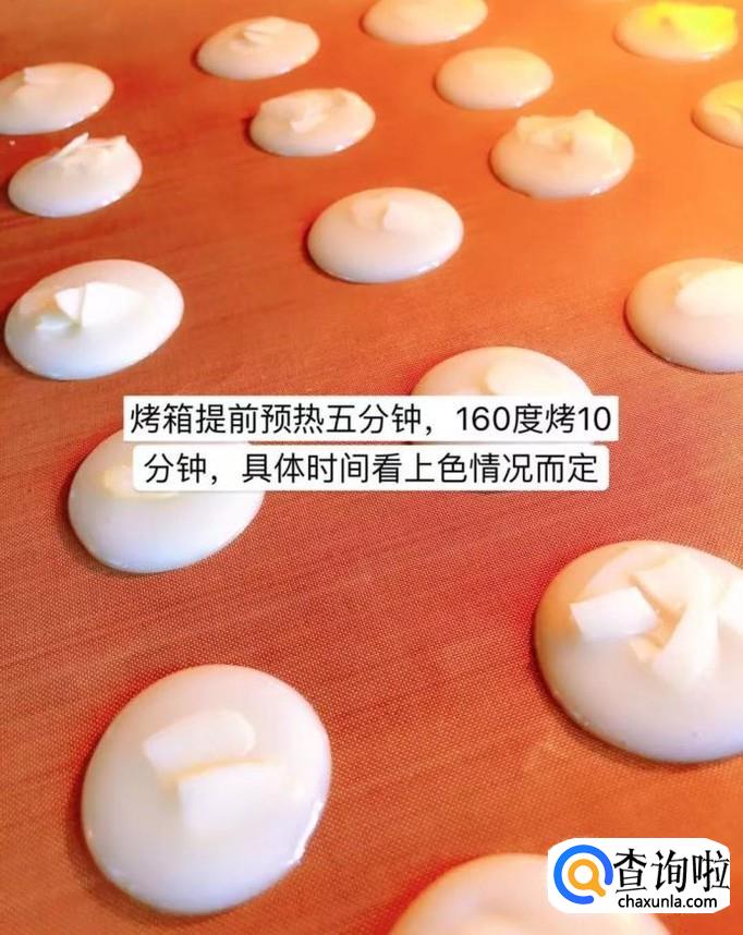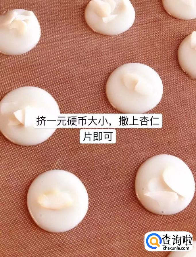 然后在烤盘上挤出一个一元硬币大小的圆饼并撒上杏仁片,如下图所示。