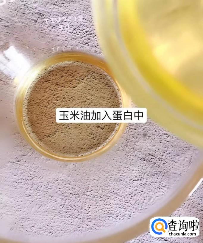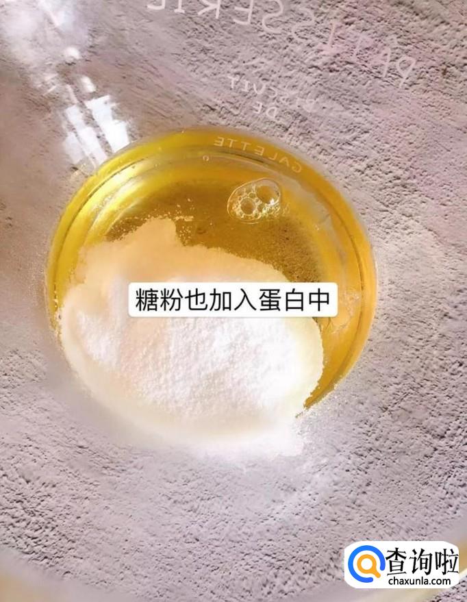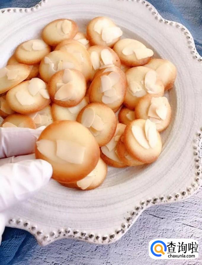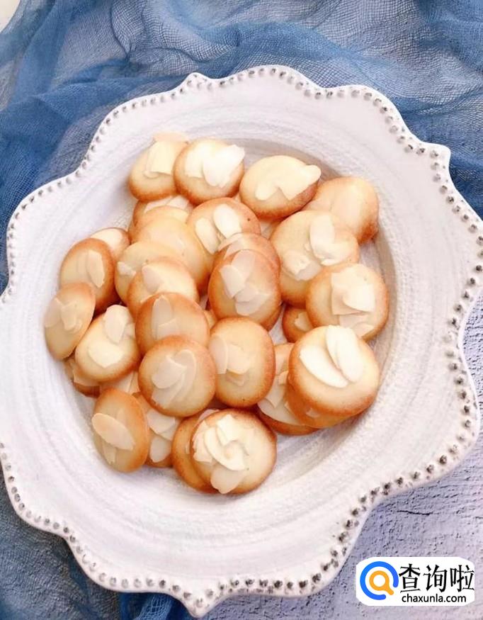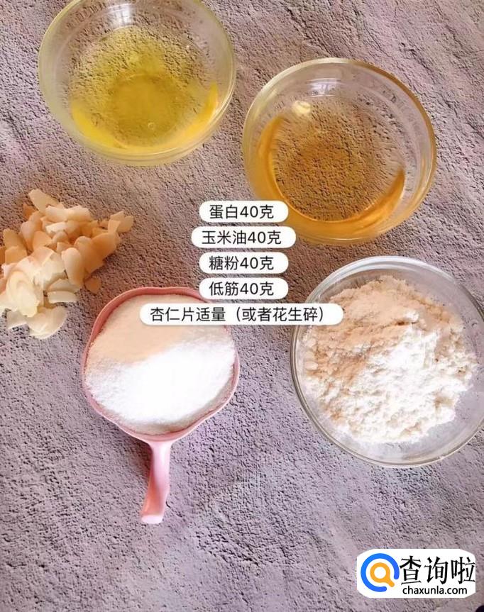 食材:蛋白40克,玉米油40克,糖粉40克,低筋面粉40克,杏仁片适量。