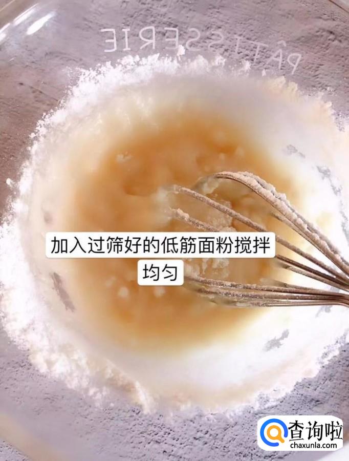 然后加入过筛的低筋面粉,搅拌均匀,如下图所示。