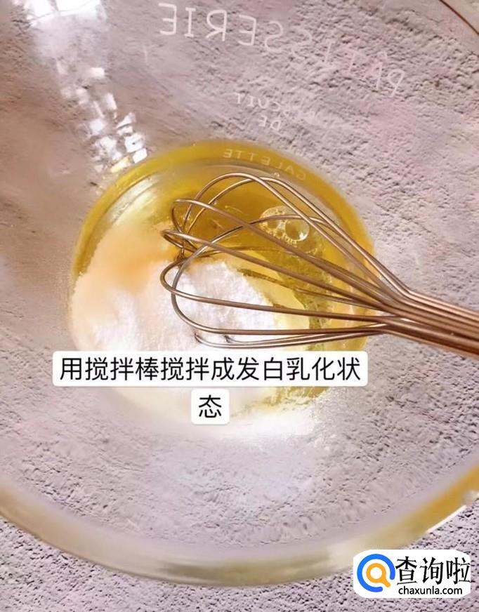 接着用打蛋器搅拌白乳状态,如下图所示。