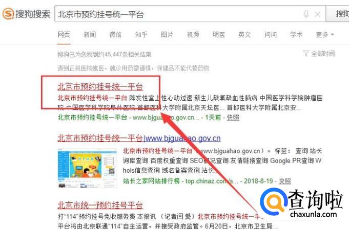 打开搜狗搜索,搜索“北京市预约挂号统一平台”,点击并进入,如图所示。