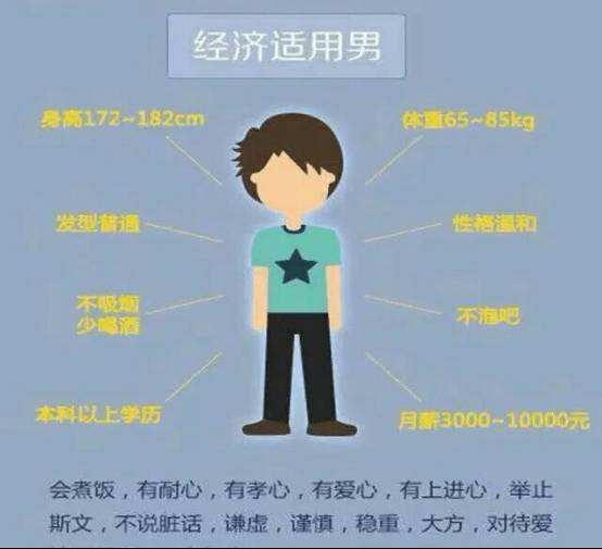 经济男是指身高一般、发型传统,相貌过目即忘,性格温和,工资无偿上缴给老婆或者AA制,不吸烟、不喝酒、不关机、不赌钱、不泡吧,无红颜知己,月薪2000~10000元,有支付住房首付的能力,一般从事教育、IT、机械制造、技术类行业的男人。