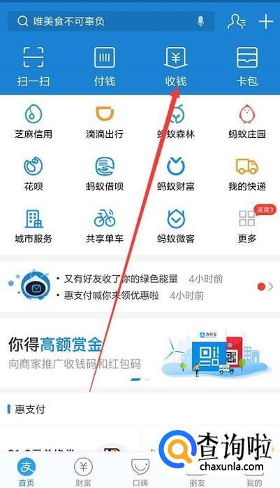 打开支付宝APP,在首页的上方,进去收款码界面;