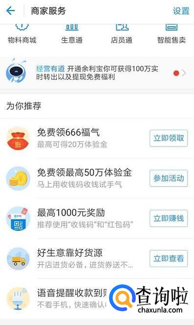 收款码详情页中,可以参加支付宝的活动,比如一些开店福利,会给大家一些奖励,包括货源;