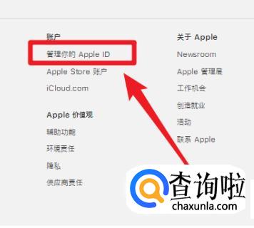 进入官网后,在页面最底部,选择【管理你的AppleID】。