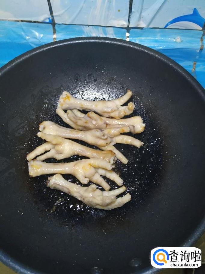 炒锅中放入适量油,油热后放入冰糖,炒出糖色,然后将鸡爪倒入锅中,翻炒均匀,让糖色均匀的粘在鸡爪上。
