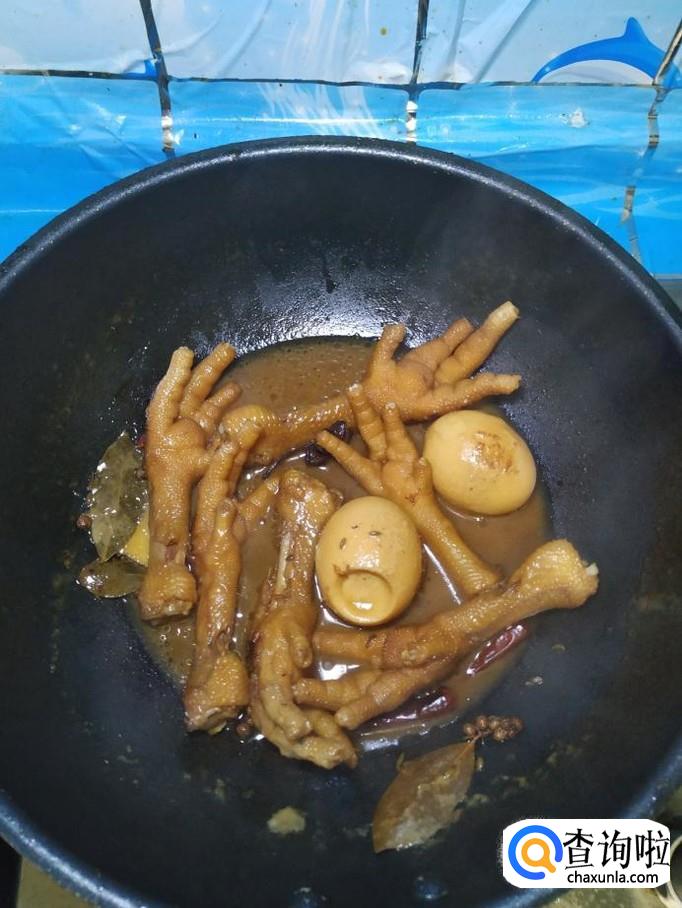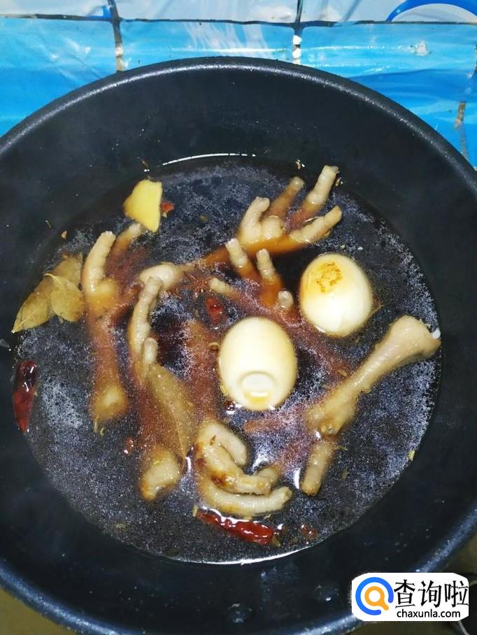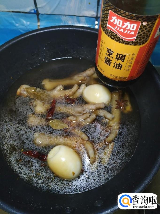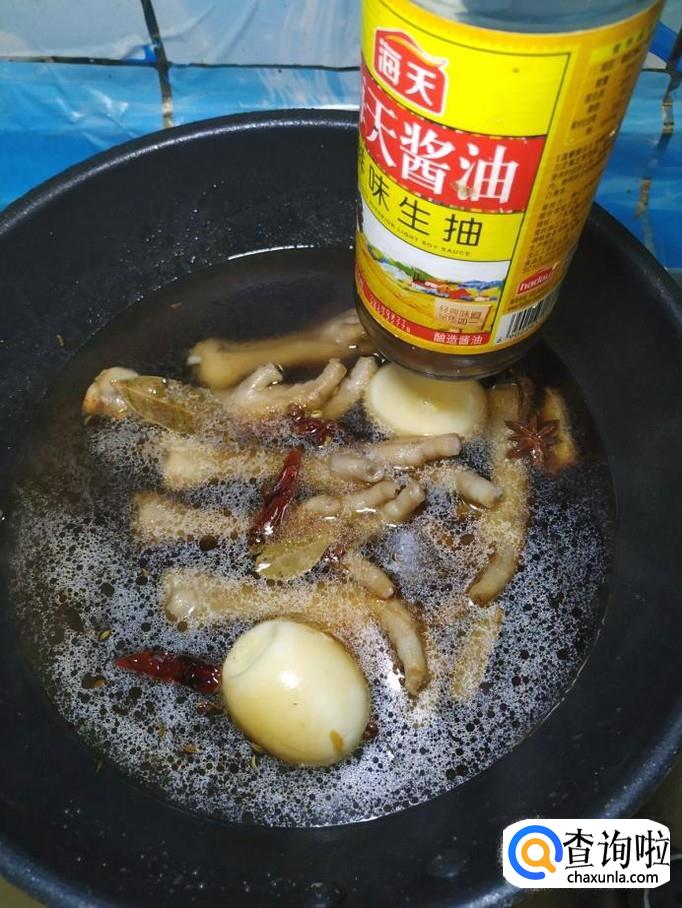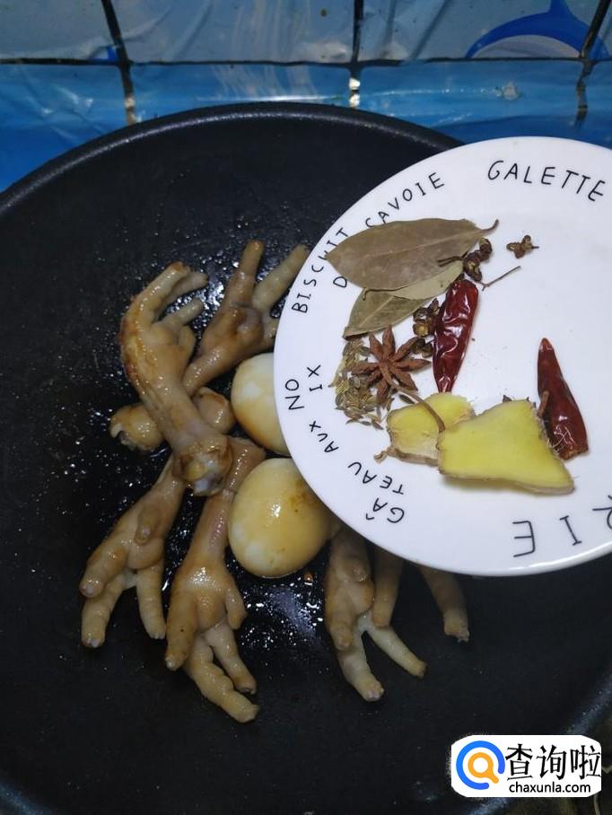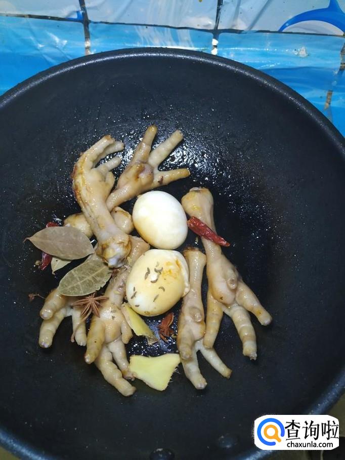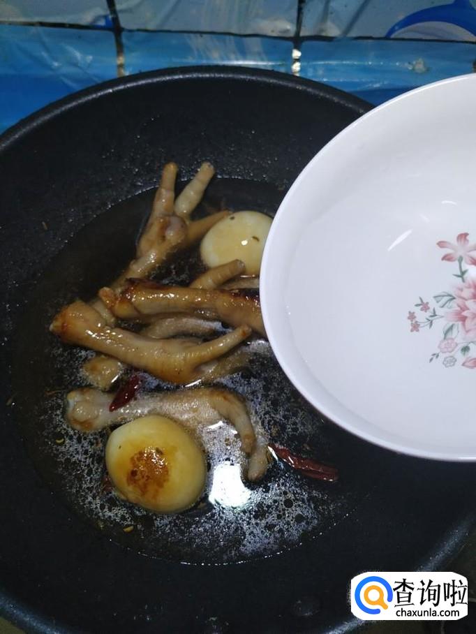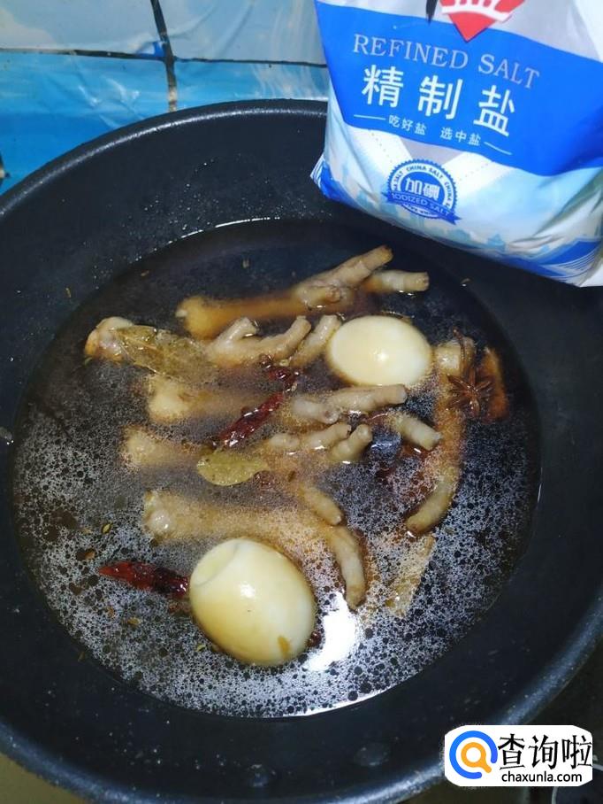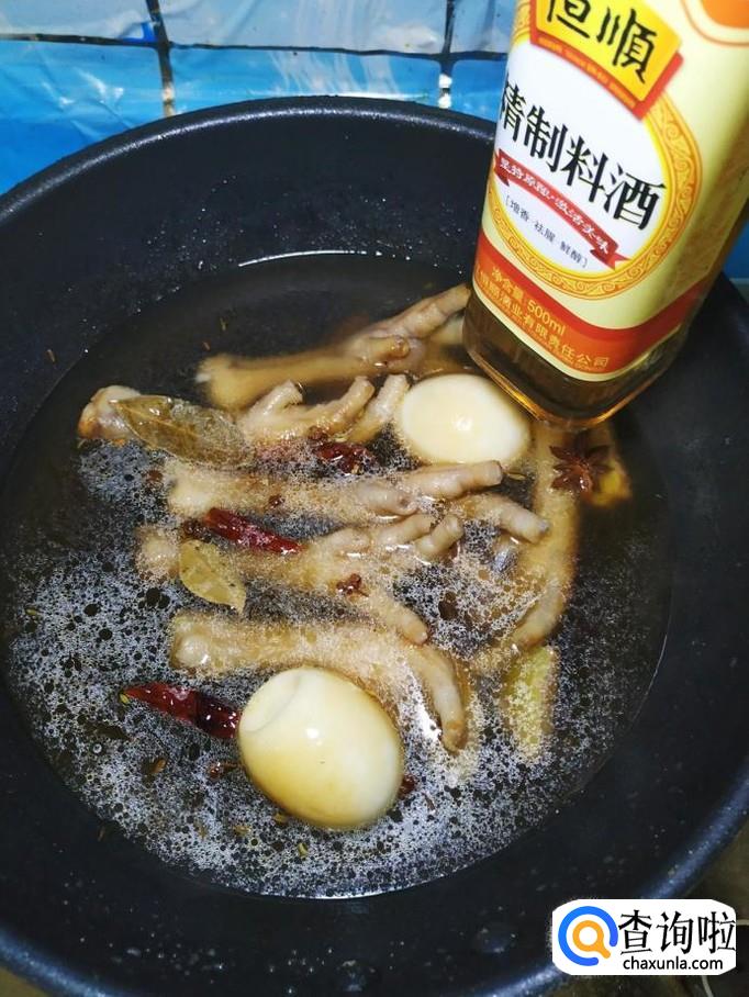 加入一大碗清水,没过鸡蛋和鸡爪,然后加入适量料酒除腥,再加入适量食盐。