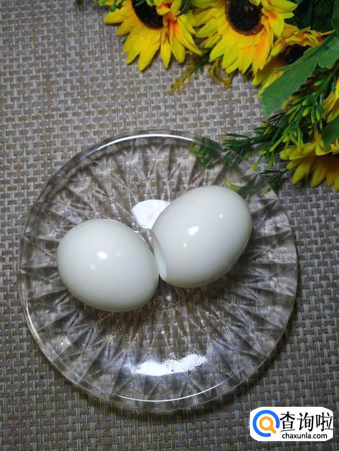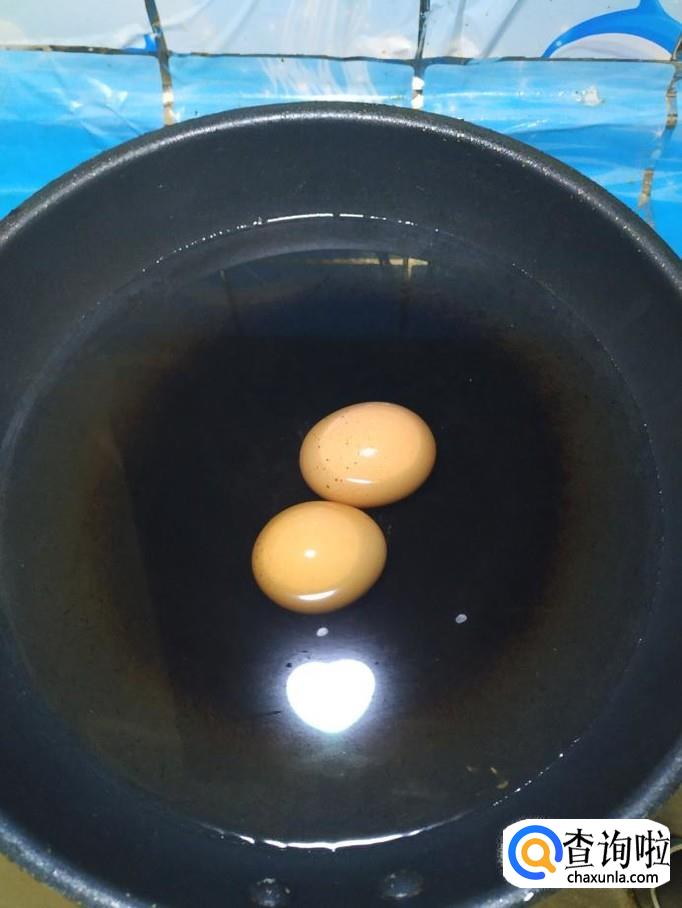 再准备两个鸡蛋,放入锅中,煮5到6分钟,然后焖一会儿,煮熟之后,捞出过凉水,去除外皮备用。