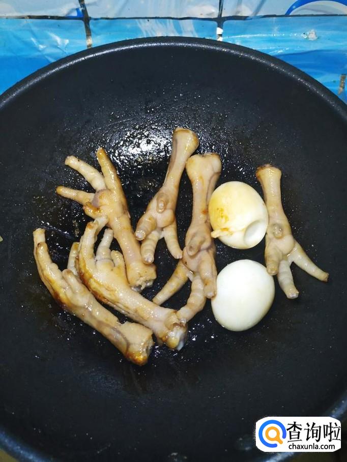 然后将之前煮好的白鸡蛋,倒入锅中,和鸡爪一起翻炒均匀。