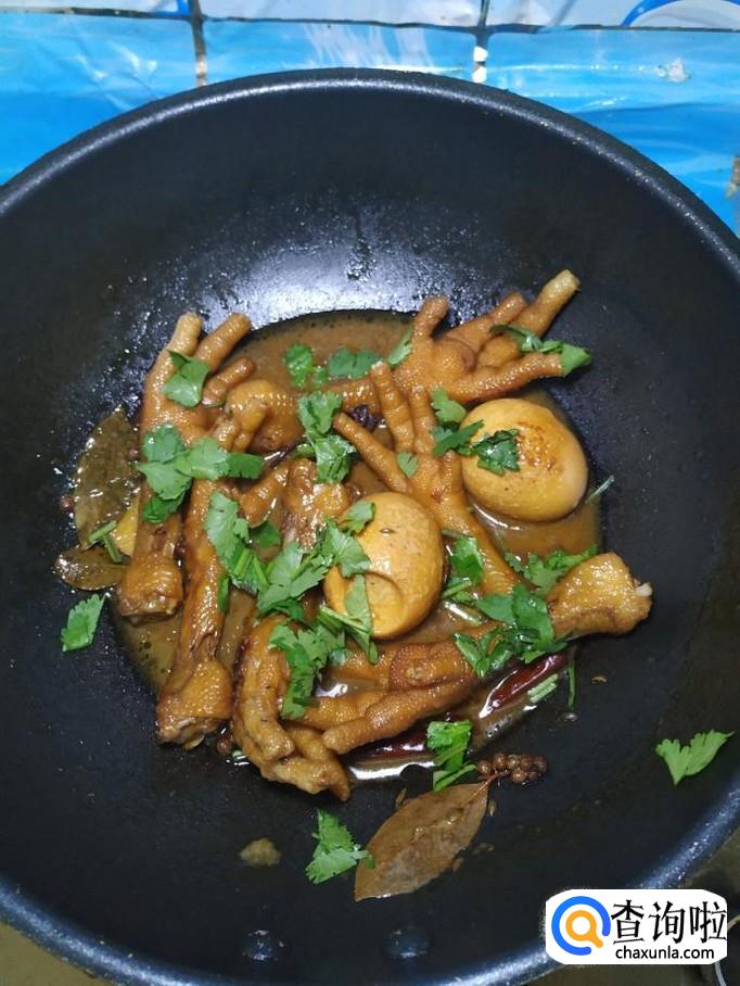鸡爪适量,鸡蛋适量,香菜适量,盐,糖适量,盐适量,鸡精适量,料酒适量,生抽适量,老抽适量,干辣椒适量,香叶适量,八角适量,花椒适量,姜适量。
