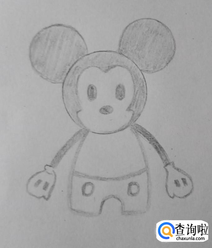 紧接着是米奇的身体,身体与头部大小比例相当,并画上米奇的裤子。